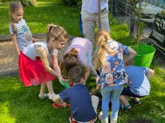 Mit großen Augen beobachten die Kinder, was ein Mädchen am Montag mit in die KiTa brachte: einen kleinen Amberbaum. Dieser Baum ist ein Abschiedsgeschenk an die...