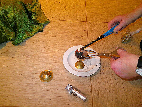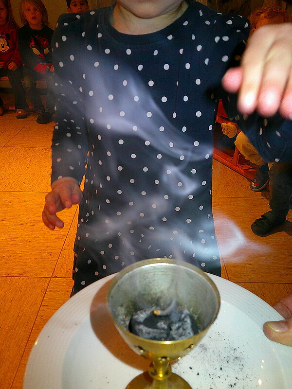 Im Rahmen einer kindgerechten Einführung erfuhren die Kinder, dass Weihrauch aus dem Harz eines Baumes gewonnen wird und zum Räuchern glühende Kohle benötigt wird. Dabei wurde erklärt, dass der aufsteigende Rauch in vielen religiösen Traditionen als Symbol für Gebete verstanden wird, die in den Himmel steigen.