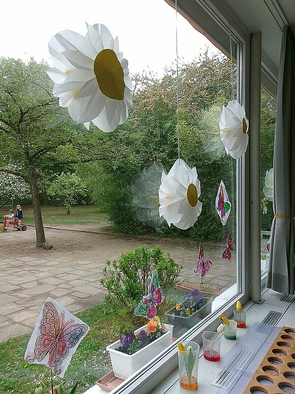 Aus Butterbrottüten werden Gänseblümchen: Auch Nachhaltigkeit spielte eine große Rolle. Aus übrig gebliebenen Butterbrottüten bastelten die Kinder große Gänseblümchen. Acht Tüten wurden zusammengeklebt, ausgeschnitten und in eine perfekte Form gebracht. Den letzten Schliff erhielten die Blumen durch gelbes Papier, das als "Blütenstempel" in die Mitte geklebt wurde.