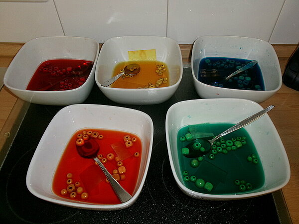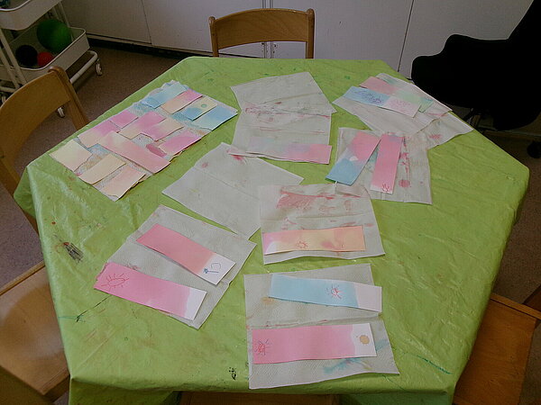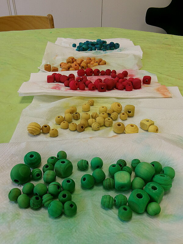 Den Zauber der Farben entdecken: Mit der übrig gebliebenen Eierfarbe wurden naturfarbene Perlen kreativ gefärbt. Mit Aquarellpapier experimentierten die Kinder außerdem, wie sich Farben auf Papier übertragen. Das Ergebnis: Das Papier saugte das eingefärbte Wasser auf und es entstanden faszinierende Farbverläufe - ein Lehrstück über die Eigenschaften von Materialien und deren Zusammenspiel.