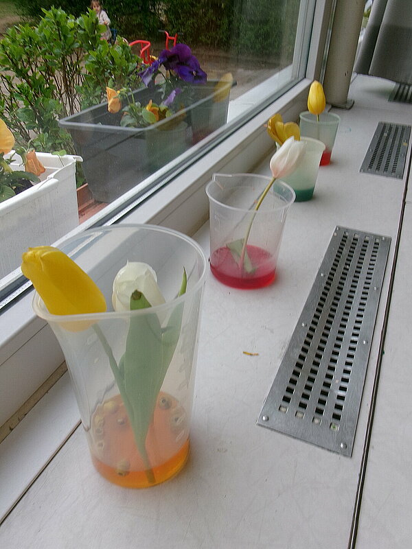 Tulpen im Farbexperiment: Schließlich konnten die Kinder beobachten, wie Tulpen im Farbtopf badeten. Die Veränderung der Blumen durch die Farbe regte zu Gesprächen und Neugier an - ein anschauliches Beispiel dafür, wie das Experimentieren das Lernen bereichern kann.
