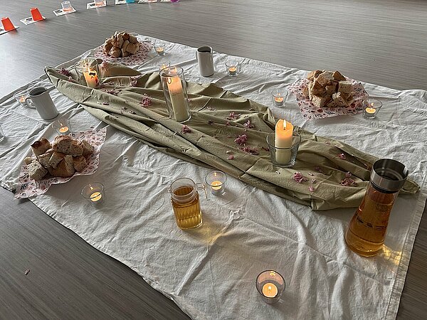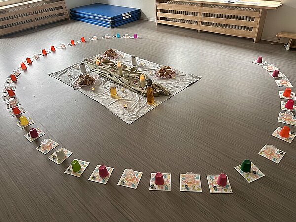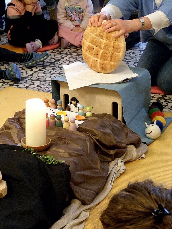 An Gründonnerstag hören die Kinder die Bibelgeschichte vom letzten Abendmahl: Jesus isst mit seinen Freunden und wäscht ihnen die Füße. Auch die KiTa-Kinder teilen Brot und Traubensaft und waschen sich, wenn sie mögen, gegenseitig die Hände und Füße.