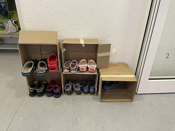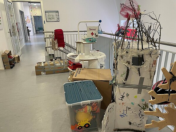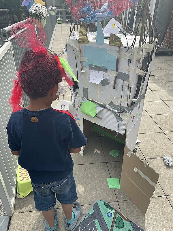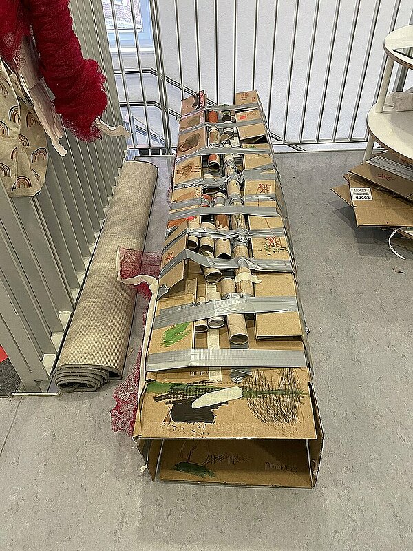 Im freien Spiel entstand die Idee, eine eigene Höhle aus Pappkartons und Werkzeugen zu errichten. Die pädagogischen Fachkräfte griffen diesen Impuls im Sinne des Situationsansatzes auf und begleiteten die Kinder bei ihrer selbstbestimmten Planung. Mit ihrem Erfahrungsschatz aus der KiTa-Baustelle erkannten die jungen Baumeister*innen schnell, welche Materialien gebraucht wurden: Kisten, Stöcke und Klebeband – die Grundpfeiler ihrer neuen Konstruktion.