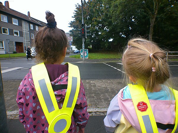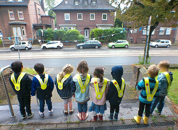 Ausgestattet mit Warnwesten begaben sich die älteren Kinder auf Erkundungstour in die Umgebung und wurden zu Straßenforscher*innen: Gemeinsam mit den KiTa-Mitarbeiter*innen lernten sie, Verkehrssituationen mit Augen und Ohren wahrzunehmen und einzuschätzen und entdeckten Straßenschilder und Ampeln.