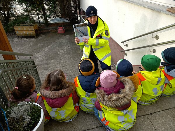 Danach ging es in die Praxis: Ausgestattet mit Warnwesten schauten sich die Kinder gemeinsam mit der Polizistin und den KiTa-Mitarbeiter*innen Bürgersteige und Ampeln an einer Straße genau an. Im Anschluss wechselten sie an einer beruhigten Straße unter Aufsicht selbstständig die Straßenseite. Am Ende erhielten alle Kinder ihren Fußgänger-Führerschein: Dieser bescheinigt, dass die Kinder wertvolle Regeln zum sicheren Verhalten im Verkehr erkundet und selbstständig angewendet haben.