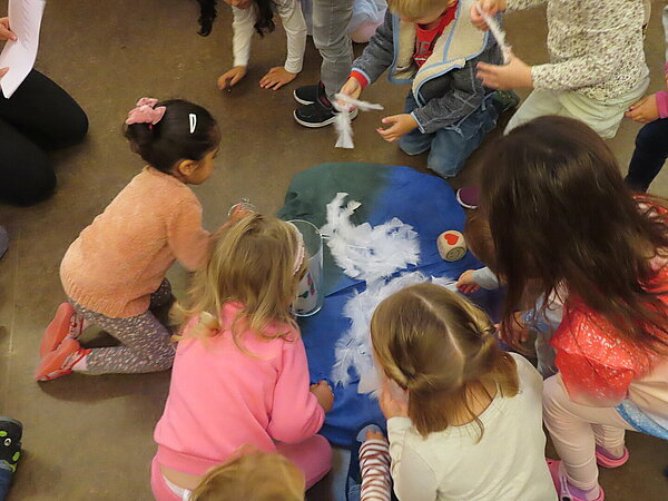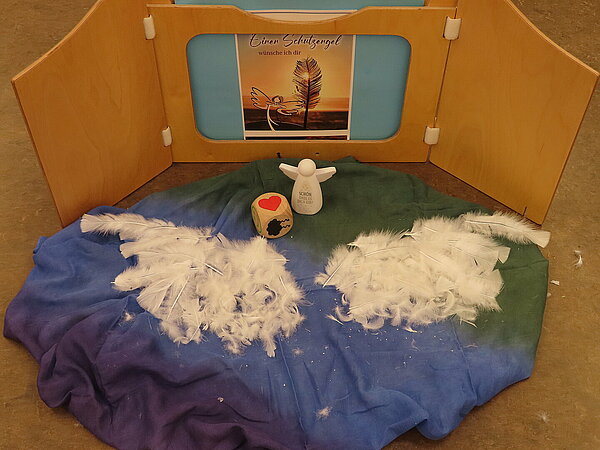 Der aktuelle Lichtmoment stand ganz im Zeichen der Schutzengel. Schon beim Betreten der Halle wurden die Kinder von einer zauberhaften Atmosphäre empfangen: Der Boden war mit weißen Federn bedeckt, die wie Engelsflügel wirkten, und in der Mitte stand ein selbstgestalteter Schutzengel, der zum Nachdenken und Staunen einlud.