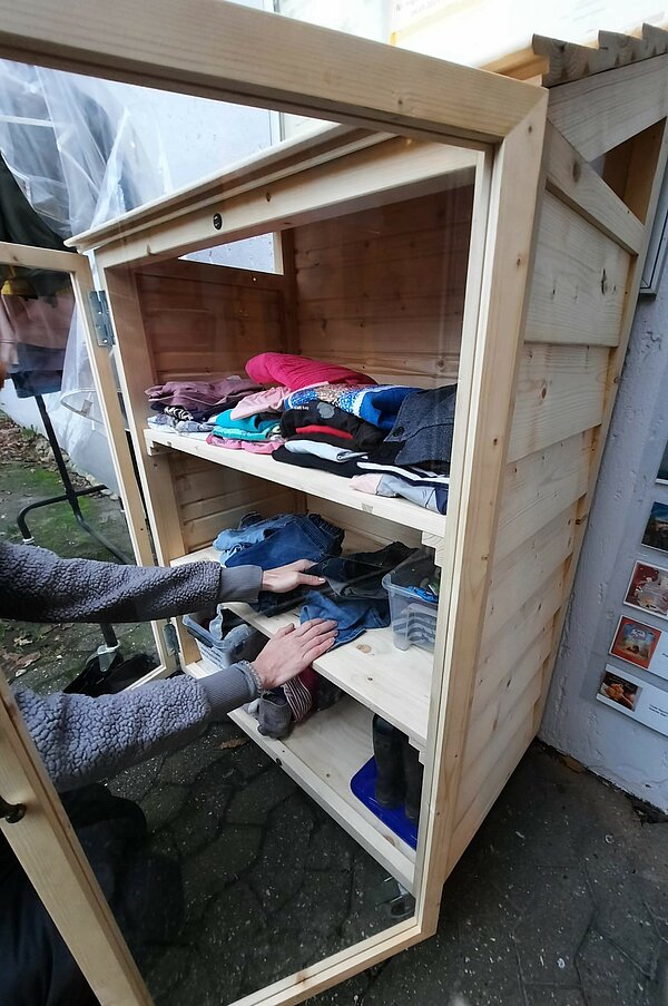 Das Prinzip: Was die eine nicht mehr braucht, sucht der andere dringend. Familien können Kinderkleidung und Schuhe in den Schrank legen. Wer etwas benötigt, kann es jederzeit herausnehmen.