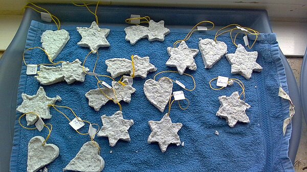 Als Ausgangsmaterial dient geschreddertes Papier aus dem Aktenvernichter, das ansonsten entsorgt worden wäre. Dieses wird mit Wasser aufgeweicht und mithilfe eines Mixstabs zu einer formbaren Masse verarbeitet. Anschließend drücken die Kinder die Papiermasse mit einem Bändchen in Plätzchenformen, lösen sie vorsichtig heraus und lassen die Figuren trocknen.