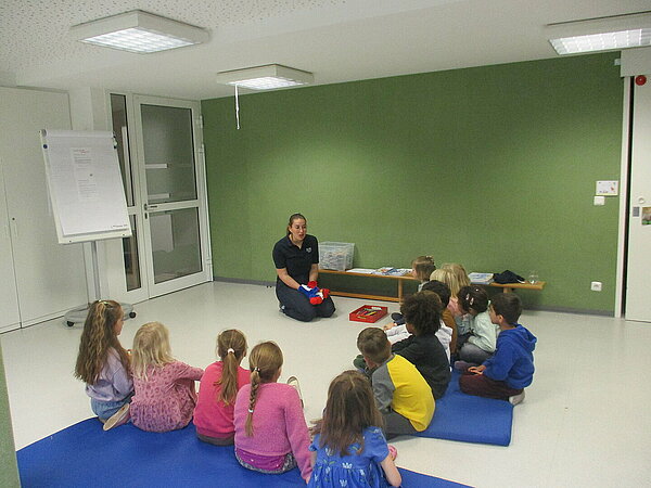An drei Vormittagen setzten sich die Kinder spielerisch mit den Verhaltensregeln im Wasser auseinander. Sie lernten unter anderem ein Lied zu den Baderegeln mit passenden Bewegungen, sprachen über die Bedeutung der einzelnen Vorschriften und ordneten sie passenden Bildern zu. Darüber hinaus erfuhren die Kinder, was sie im Notfall tun können – zum Beispiel, wie man einen Notruf absetzt.