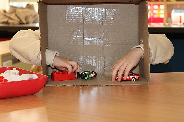 Aus dieser Erfahrung entstand die Idee, einen Tastkasten zu bauen. Die Kinder gestalteten gemeinsam mit den pädagogischen Fachkräften einen Karton, durch den sie verschiedene Spielzeugfiguren, -autos oder Bausteine ertasten konnten, ohne sie zu sehen. Anschließend suchten sie die passenden Dinge aus einer Schale heraus und überprüften, ob ihre Vermutung stimmte. Durch die Auseinandersetzung mit ihren Sinnen lernen die Kinder, sich auf einzelne Dinge zu konzentrieren und diese bewusst wahrzunehmen.