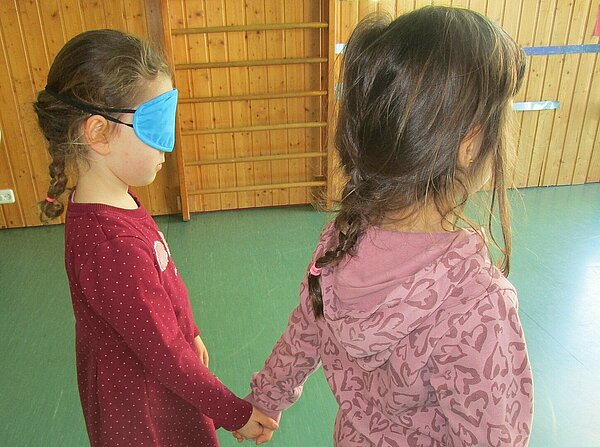 Zuletzt hörten die Kinder die Geschichte über Bartimäus, einen blinden Bettler, der von Jesus geheilt wurde. Anschließend spielten die Kinder das Gehörte nach: Je ein Kind mit einer Augenbinde wurde von einem sehenden Kind durch den Bewegungsraum der KiTa geführt. Dabei erfuhren die Kinder, wie wichtig gegenseitige Unterstützung und Vertrauen sind.